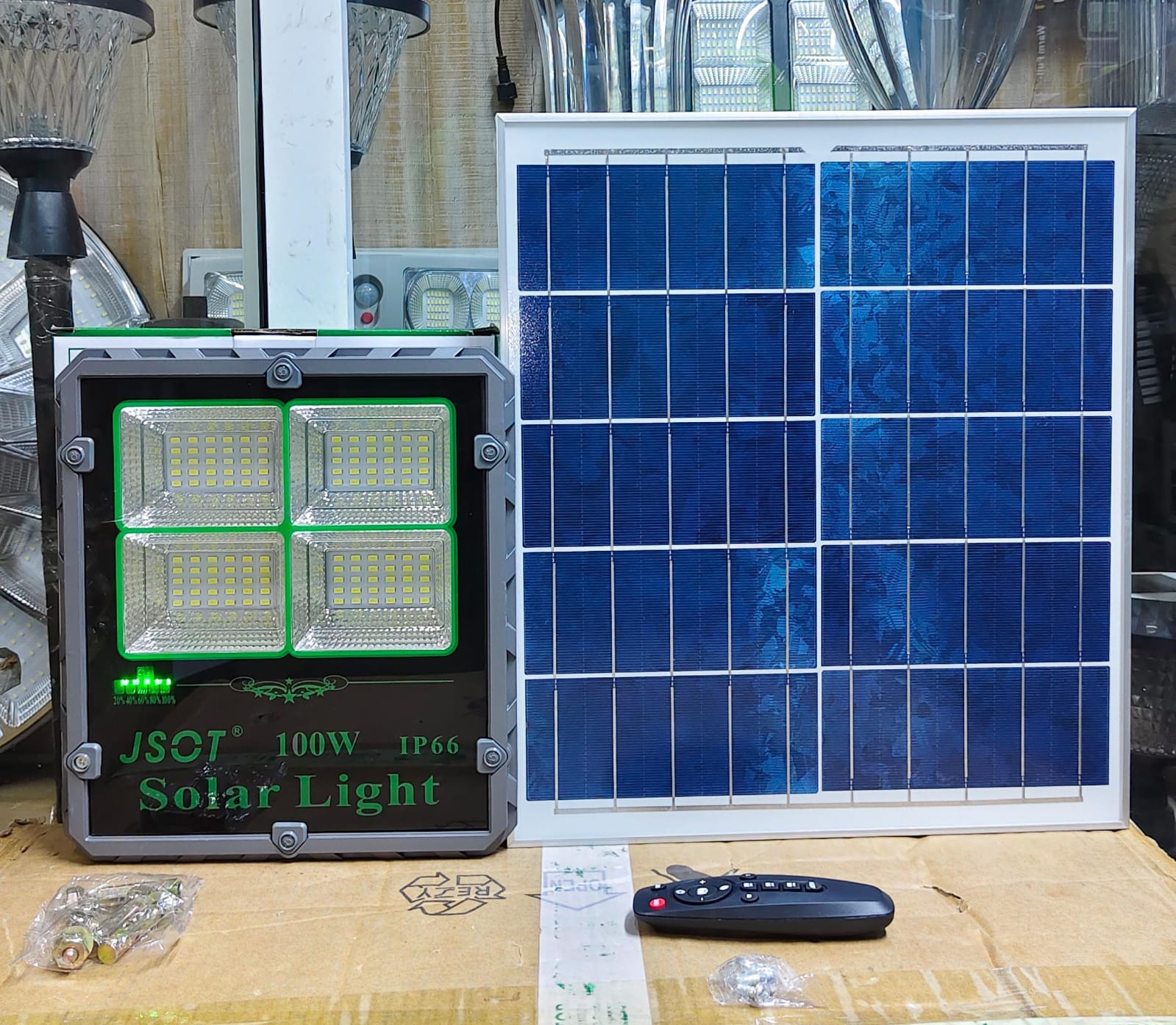 The JSOT 100W TR Solar Floodlight is a powerful, energy-efficient lighting solution designed for outdoor security and area illumination. It uses solar energy to provide bright, reliable lighting without increasing electricity costs. Built with a rugged, weatherproof design, it is ideal for both residential and commercial outdoor spaces where consistent night lighting is needed.
