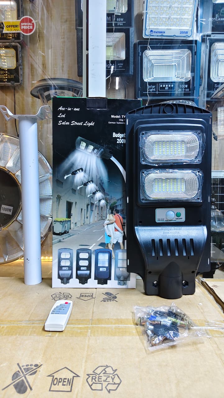 The 200W Budget Solar Street Light with Pole is a practical and affordable outdoor lighting solution designed for roads, estates, rural areas, and commercial compounds. It combines a high-efficiency LED light, solar panel, battery system, and mounting pole into one complete kit. The system charges during the day using solar energy and automatically provides bright illumination at night, making it ideal for off-grid and low-power locations.